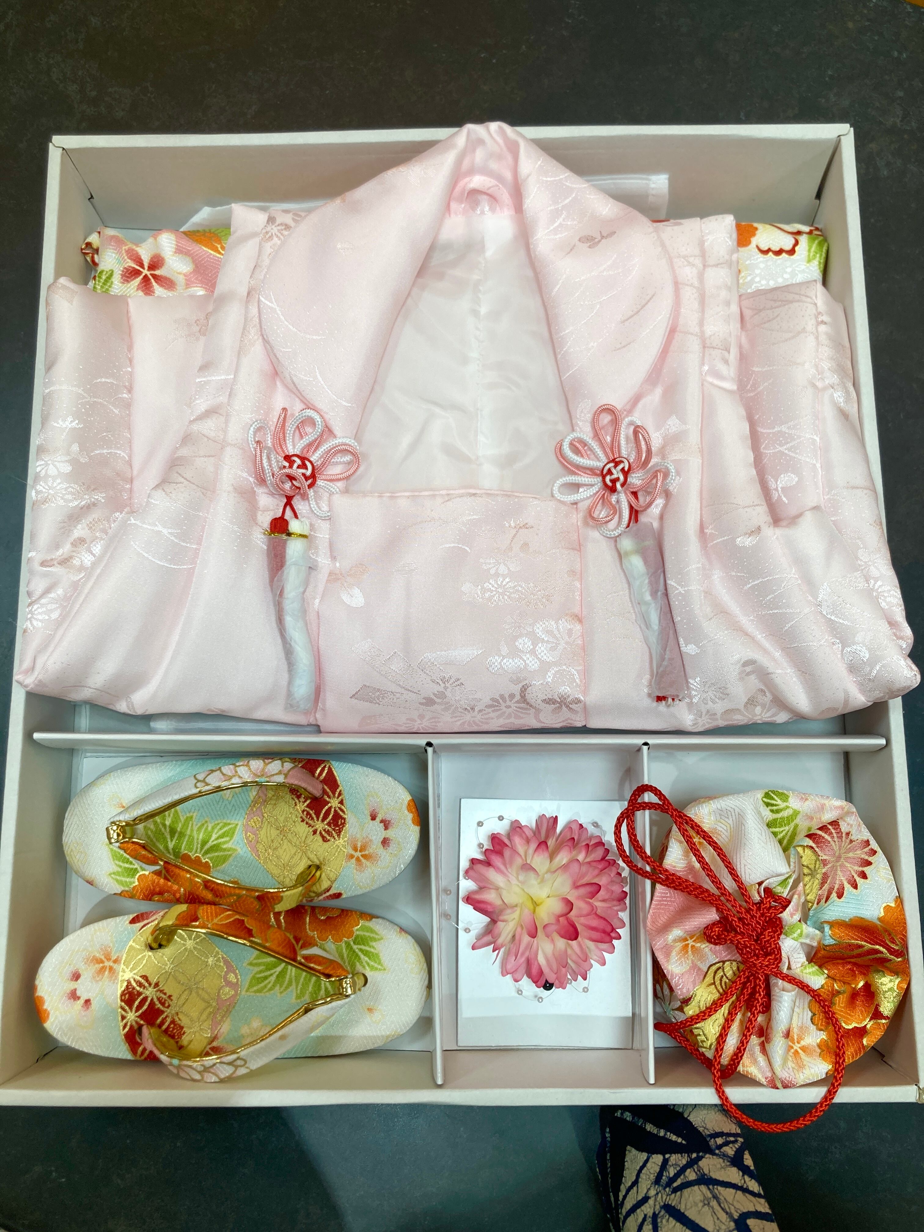 セットには、華やかな模様が施された祝着と、それにぴったりの小物が含まれています。これで、七五三のお祝いに必要なアイテムはすべて揃います。お宮参りや写真撮影、家族との集まりなど、さまざまなシーンでご利用いただけるので、成長の記念を美しく彩るアイテムとして最適です。